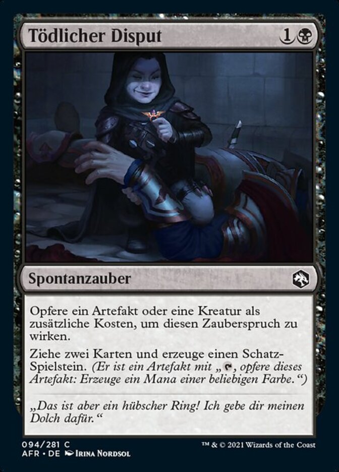| Rules | As an additional cost to cast this spell, sacrifice an artifact or creature. Draw two cards and create a Treasure token. (It's an artifact with ", Sacrifice this artifact: Add one mana of any color.") |
