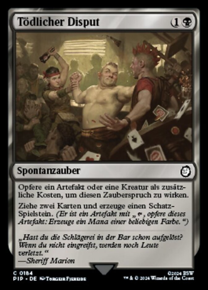| Rules | As an additional cost to cast this spell, sacrifice an artifact or creature. Draw two cards and create a Treasure token. (It's an artifact with ", Sacrifice this artifact: Add one mana of any color.") |