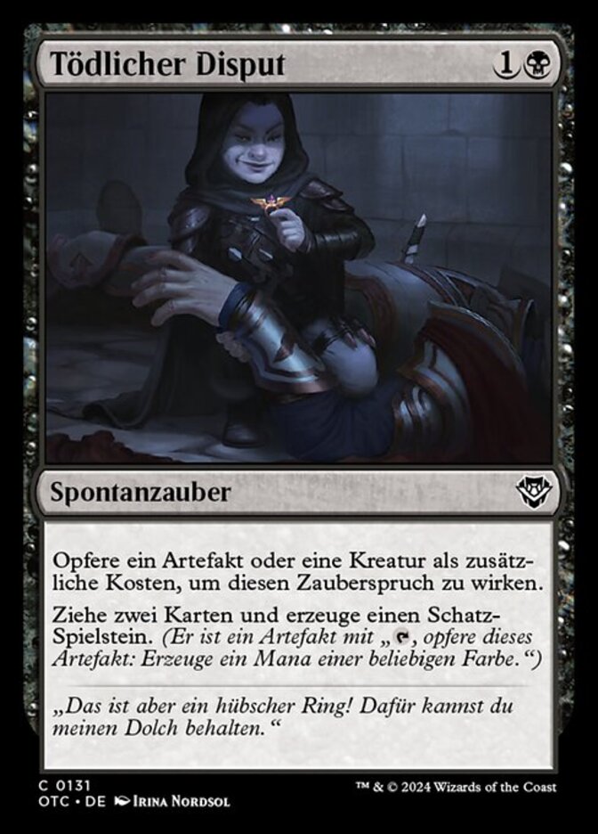 | Rules | As an additional cost to cast this spell, sacrifice an artifact or creature. Draw two cards and create a Treasure token. (It's an artifact with ", Sacrifice this artifact: Add one mana of any color.") |
