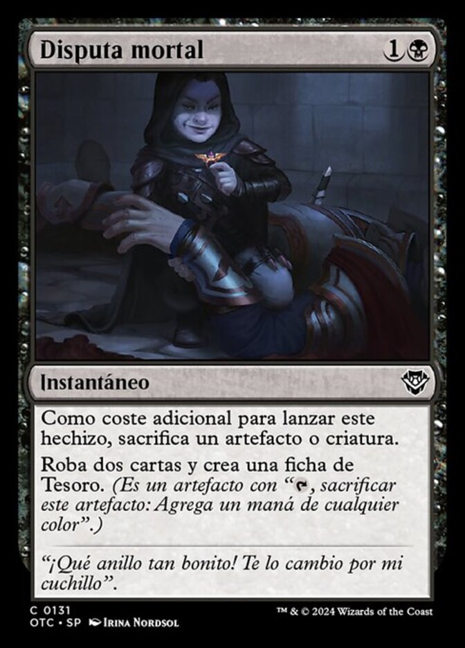 | Rules | As an additional cost to cast this spell, sacrifice an artifact or creature. Draw two cards and create a Treasure token. (It's an artifact with ", Sacrifice this artifact: Add one mana of any color.") |
