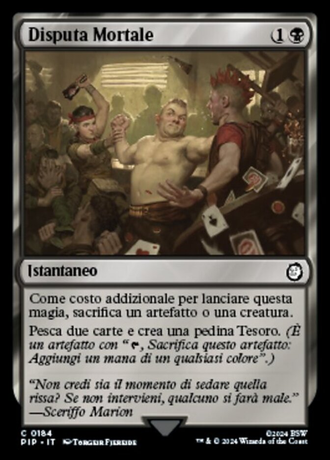 | Rules | As an additional cost to cast this spell, sacrifice an artifact or creature. Draw two cards and create a Treasure token. (It's an artifact with ", Sacrifice this artifact: Add one mana of any color.") |