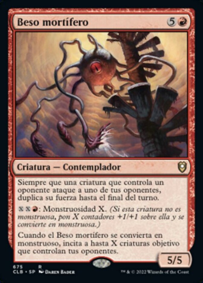 | Rules | Whenever a creature an opponent controls attacks one of your opponents, double its power until end of turn. : Monstrosity X. (If this creature isn't monstrous, put X +1/+1 counters on it and it becomes monstrous.) When Death Kiss becomes monstrous, goad up to X target creatures your opponents control. |