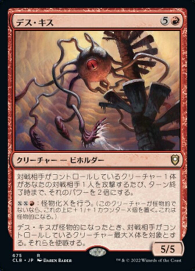| Rules | Whenever a creature an opponent controls attacks one of your opponents, double its power until end of turn. : Monstrosity X. (If this creature isn't monstrous, put X +1/+1 counters on it and it becomes monstrous.) When Death Kiss becomes monstrous, goad up to X target creatures your opponents control. |