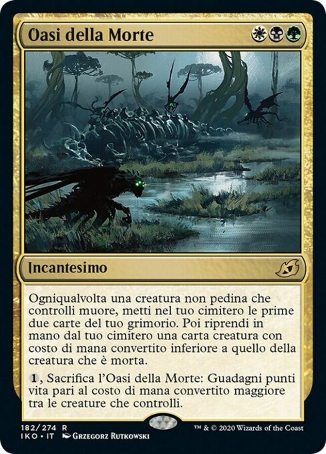 | Rules | Whenever a nontoken creature you control dies, mill two cards. Then return a creature card with lesser mana value than the creature that died from your graveyard to your hand. , Sacrifice Death's Oasis: You gain life equal to the highest mana value among creatures you control. |