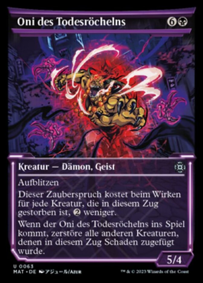 | Rules | Flash This spell costs less to cast for each creature that died this turn. When Death-Rattle Oni enters the battlefield, destroy all other creatures that were dealt damage this turn. |