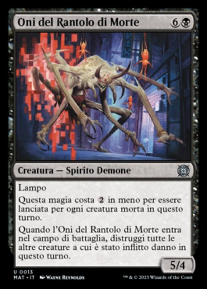 | Rules | Flash This spell costs less to cast for each creature that died this turn. When Death-Rattle Oni enters the battlefield, destroy all other creatures that were dealt damage this turn. |