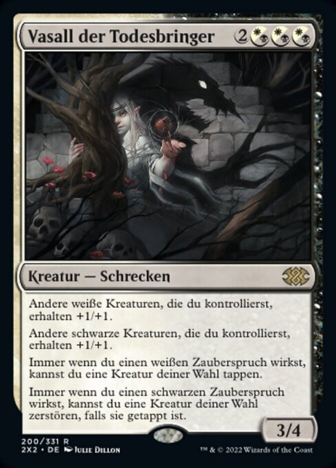 | Rules | Other white creatures you control get +1/+1. Other black creatures you control get +1/+1. Whenever you cast a white spell, you may tap target creature. Whenever you cast a black spell, you may destroy target creature if it's tapped. |