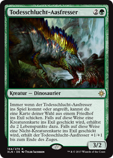 | Rules | Whenever Deathgorge Scavenger enters the battlefield or attacks, you may exile target card from a graveyard. If a creature card is exiled this way, you gain 2 life. If a noncreature card is exiled this way, Deathgorge Scavenger gets +1/+1 until end of turn. |
