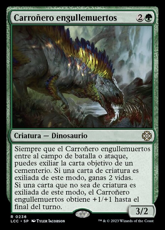 | Rules | Whenever Deathgorge Scavenger enters the battlefield or attacks, you may exile target card from a graveyard. If a creature card is exiled this way, you gain 2 life. If a noncreature card is exiled this way, Deathgorge Scavenger gets +1/+1 until end of turn. |
