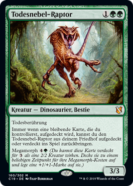 | Rules | Deathtouch Whenever a permanent you control is turned face up, you may return Deathmist Raptor from your graveyard to the battlefield face up or face down. Megamorph (You may cast this card face down as a 2/2 creature for . Turn it face up any time for its megamorph cost and put a +1/+1 counter on it.) |