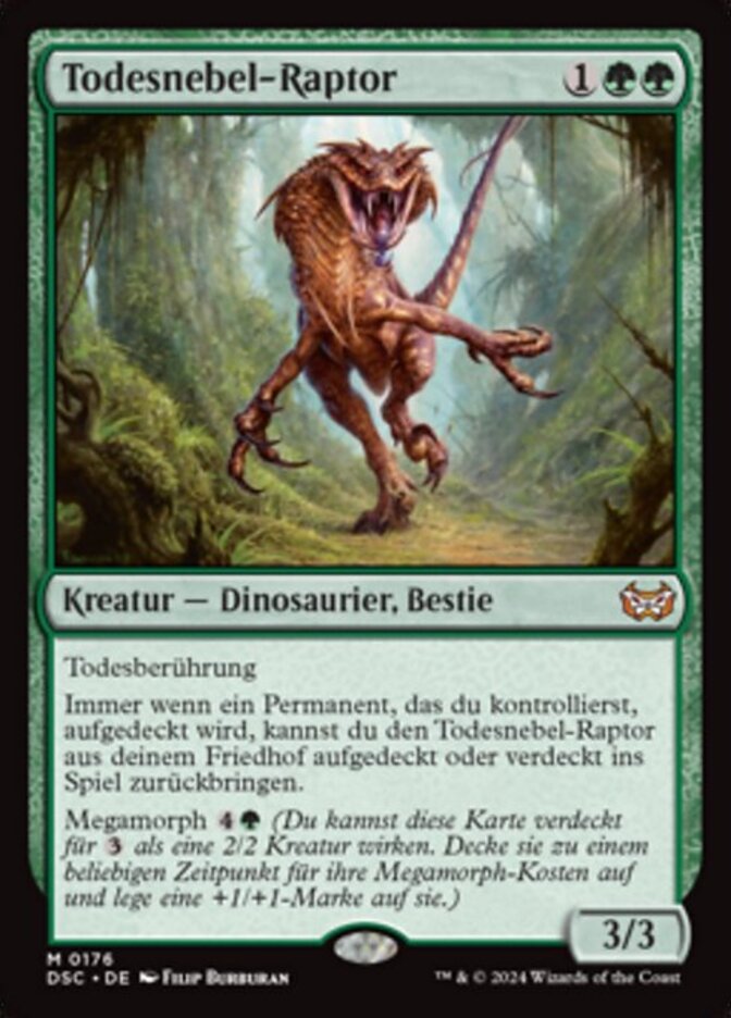 | Rules | Deathtouch Whenever a permanent you control is turned face up, you may return Deathmist Raptor from your graveyard to the battlefield face up or face down. Megamorph (You may cast this card face down as a 2/2 creature for . Turn it face up any time for its megamorph cost and put a +1/+1 counter on it.) |