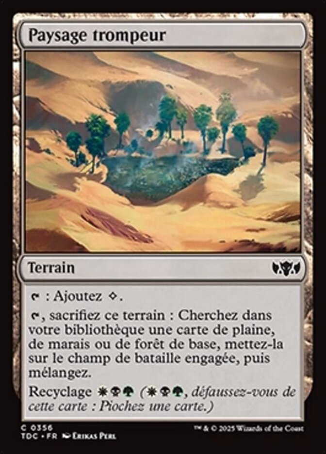 | Rules | : Add . , Sacrifice Deceptive Landscape: Search your library for a basic Plains, Swamp, or Forest card, put it onto the battlefield tapped, then shuffle. Cycling (, Discard this card: Draw a card.) |