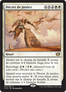 | Rules | Create X 4/4 white Angel creature tokens with flying. Cycling (, Discard this card: Draw a card.) When you cycle Decree of Justice, you may pay . If you do, create X 1/1 white Soldier creature tokens. |