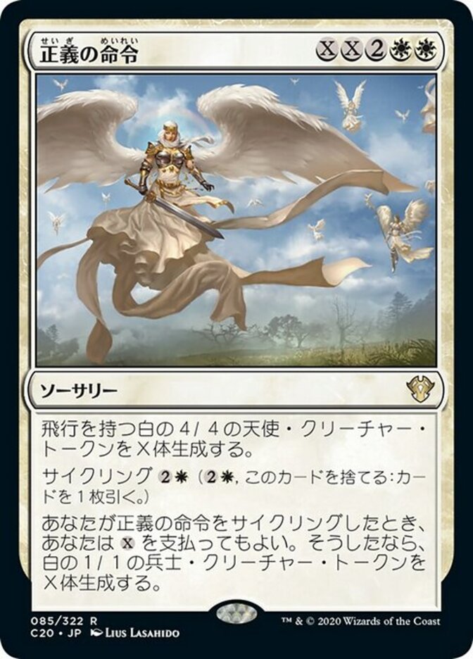 | Rules | Create X 4/4 white Angel creature tokens with flying. Cycling (, Discard this card: Draw a card.) When you cycle Decree of Justice, you may pay . If you do, create X 1/1 white Soldier creature tokens. |
