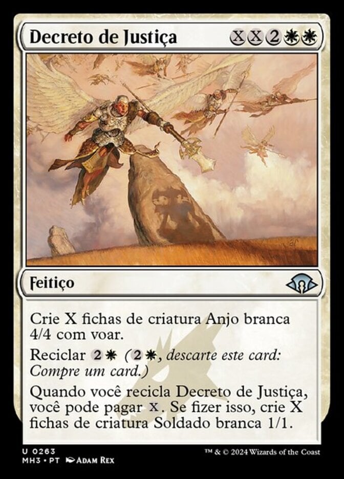 | Rules | Create X 4/4 white Angel creature tokens with flying. Cycling (, Discard this card: Draw a card.) When you cycle Decree of Justice, you may pay . If you do, create X 1/1 white Soldier creature tokens. |
