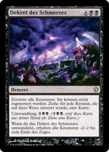 | Rules | Destroy all creatures. They can't be regenerated. Draw a card for each creature destroyed this way. Cycling (, Discard this card: Draw a card.) When you cycle Decree of Pain, all creatures get -2/-2 until end of turn. |