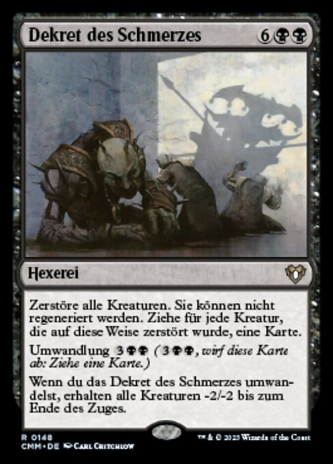 | Rules | Destroy all creatures. They can't be regenerated. Draw a card for each creature destroyed this way. Cycling (, Discard this card: Draw a card.) When you cycle Decree of Pain, all creatures get -2/-2 until end of turn. |