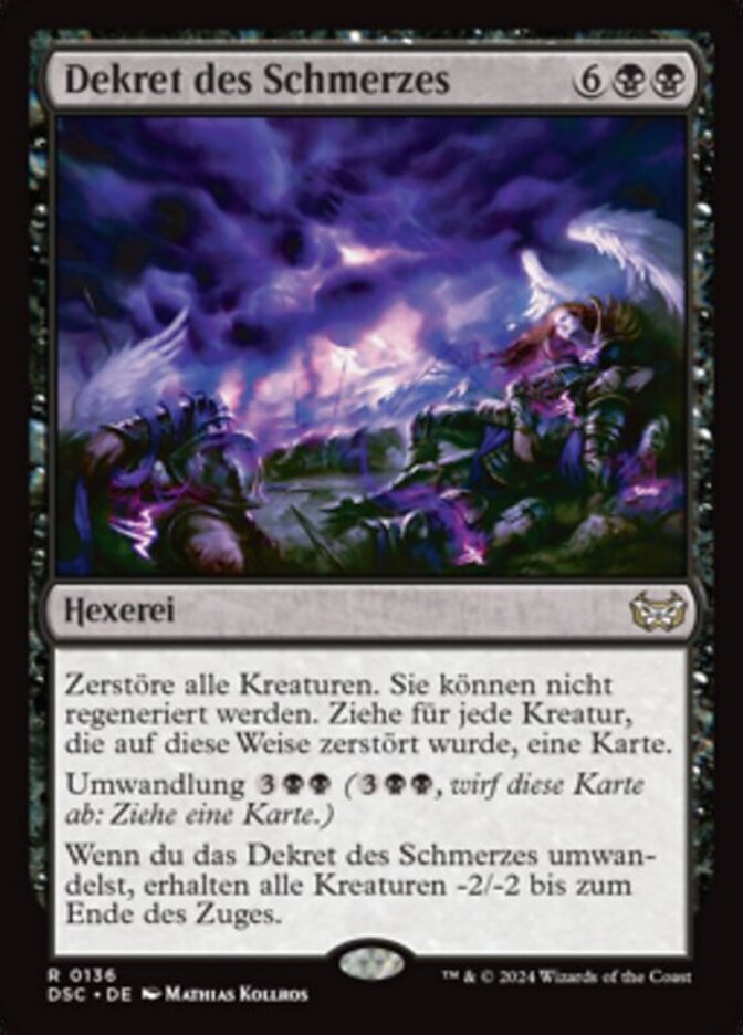 | Rules | Destroy all creatures. They can't be regenerated. Draw a card for each creature destroyed this way. Cycling (, Discard this card: Draw a card.) When you cycle Decree of Pain, all creatures get -2/-2 until end of turn. |