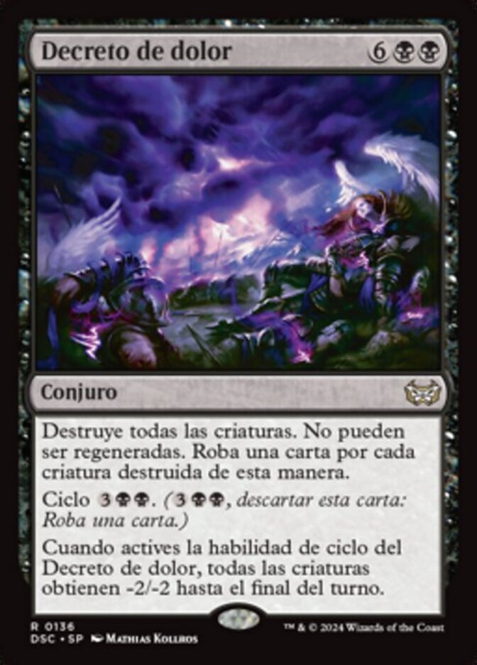 | Rules | Destroy all creatures. They can't be regenerated. Draw a card for each creature destroyed this way. Cycling (, Discard this card: Draw a card.) When you cycle Decree of Pain, all creatures get -2/-2 until end of turn. |