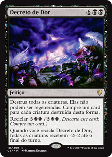 | Rules | Destroy all creatures. They can't be regenerated. Draw a card for each creature destroyed this way. Cycling (, Discard this card: Draw a card.) When you cycle Decree of Pain, all creatures get -2/-2 until end of turn. |