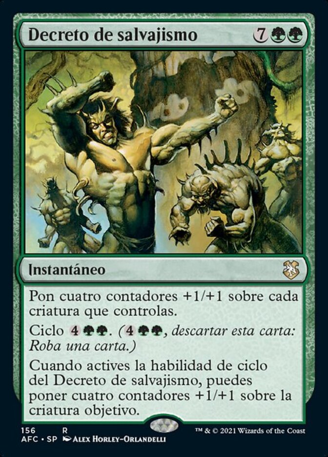| Rules | Put four +1/+1 counters on each creature you control. Cycling (, Discard this card: Draw a card.) When you cycle Decree of Savagery, you may put four +1/+1 counters on target creature. |