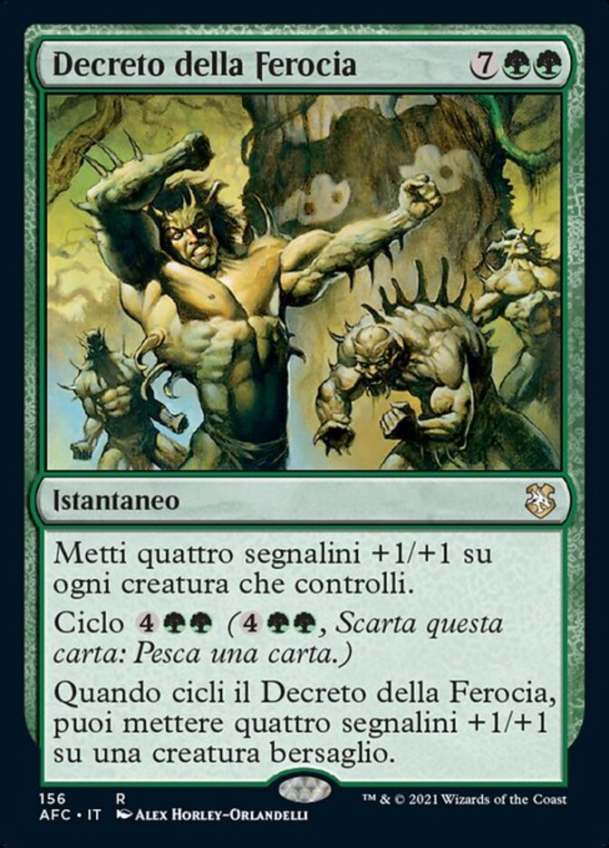 | Rules | Put four +1/+1 counters on each creature you control. Cycling (, Discard this card: Draw a card.) When you cycle Decree of Savagery, you may put four +1/+1 counters on target creature. |