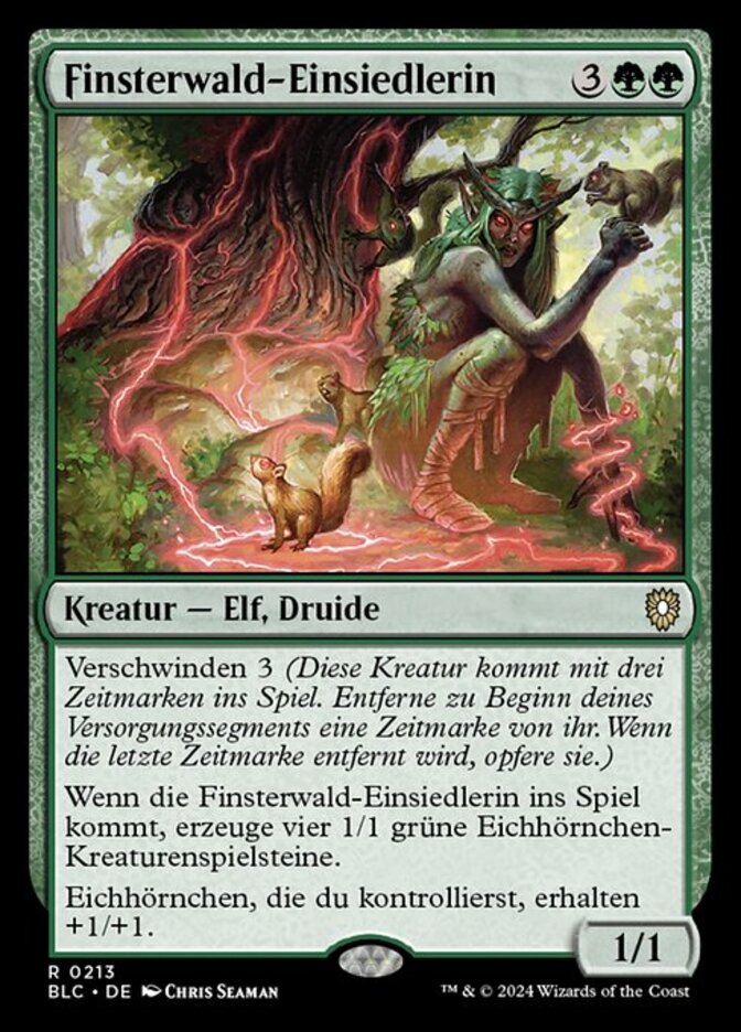 | Rules | Vanishing 3 (This creature enters the battlefield with three time counters on it. At the beginning of your upkeep, remove a time counter from it. When the last is removed, sacrifice it.) When Deep Forest Hermit enters the battlefield, create four 1/1 green Squirrel creature tokens. Squirrels you control get +1/+1. |