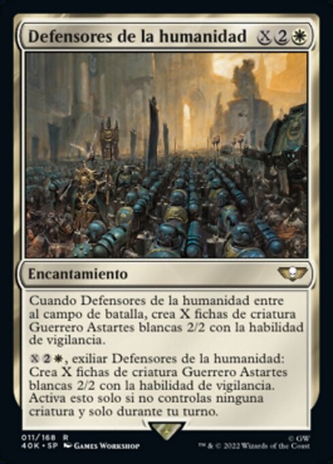 | Rules | When Defenders of Humanity enters the battlefield, create X 2/2 white Astartes Warrior creature tokens with vigilance. , Exile Defenders of Humanity: Create X 2/2 white Astartes Warrior creature tokens with vigilance. Activate only if you control no creatures and only during your turn. |