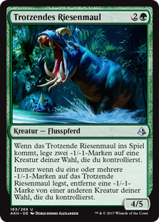 | Rules | When Defiant Greatmaw enters the battlefield, put two -1/-1 counters on target creature you control. Whenever you put one or more -1/-1 counters on Defiant Greatmaw, remove a -1/-1 counter from another target creature you control. |