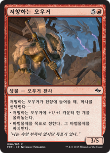 | Rules | When Defiant Ogre enters the battlefield, choose one — • Put a +1/+1 counter on Defiant Ogre. • Destroy target artifact. |