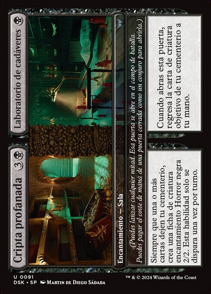 | Rules | (You may cast either half. That door unlocks on the battlefield. As a sorcery, you may pay the mana cost of a locked door to unlock it.) Whenever one or more cards leave your graveyard, create a 2/2 black Horror enchantment creature token. This ability triggers only once each turn. // (You may cast either half. That door unlocks on the battlefield. As a sorcery, you may pay the mana cost of a locked door to unlock it.) When you unlock this door, return target creature card from your graveyard to your hand. |