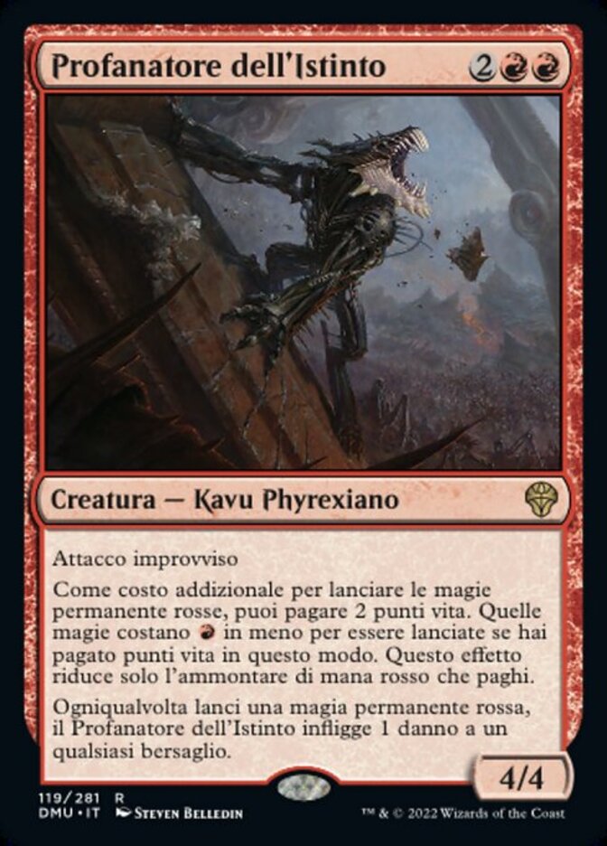 | Rules | First strike As an additional cost to cast red permanent spells, you may pay 2 life. Those spells cost less to cast if you paid life this way. This effect reduces only the amount of red mana you pay. Whenever you cast a red permanent spell, Defiler of Instinct deals 1 damage to any target. |