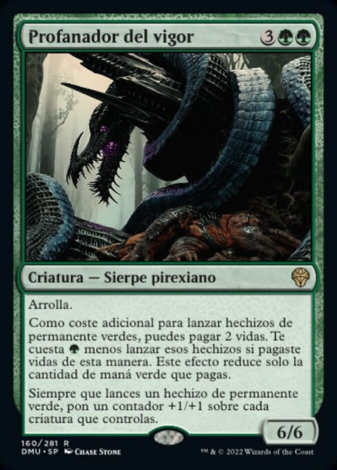 | Rules | Trample As an additional cost to cast green permanent spells, you may pay 2 life. Those spells cost less to cast if you paid life this way. This effect reduces only the amount of green mana you pay. Whenever you cast a green permanent spell, put a +1/+1 counter on each creature you control. |