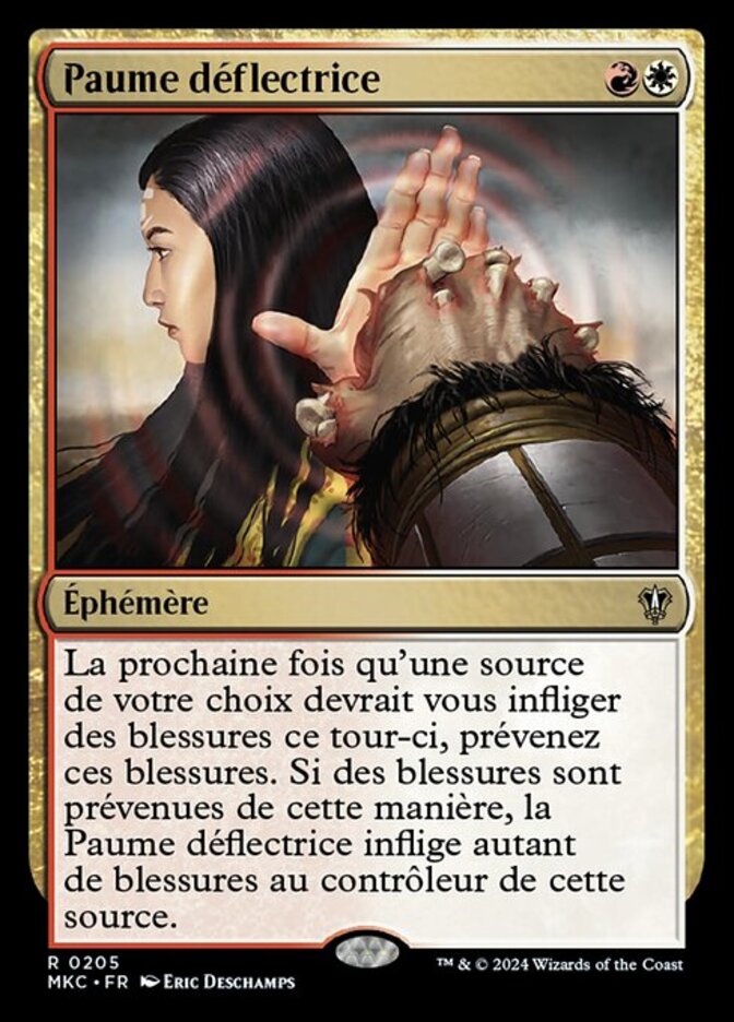 | Rules | The next time a source of your choice would deal damage to you this turn, prevent that damage. If damage is prevented this way, Deflecting Palm deals that much damage to that source's controller. |