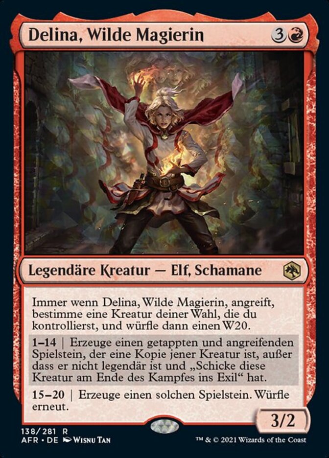 | Rules | Whenever Delina, Wild Mage attacks, choose target creature you control, then roll a d20. 1—14 | Create a tapped and attacking token that's a copy of that creature, except it's not legendary and it has "Exile this creature at end of combat." 15—20 | Create one of those tokens. You may roll again. |
