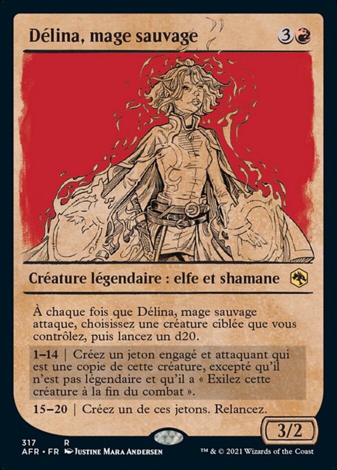 | Rules | Whenever Delina, Wild Mage attacks, choose target creature you control, then roll a d20. 1—14 | Create a tapped and attacking token that's a copy of that creature, except it's not legendary and it has "Exile this creature at end of combat." 15—20 | Create one of those tokens. You may roll again. |
