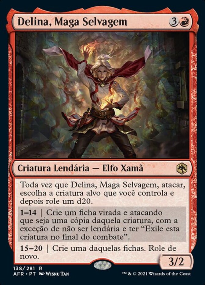 | Rules | Whenever Delina, Wild Mage attacks, choose target creature you control, then roll a d20. 1—14 | Create a tapped and attacking token that's a copy of that creature, except it's not legendary and it has "Exile this creature at end of combat." 15—20 | Create one of those tokens. You may roll again. |