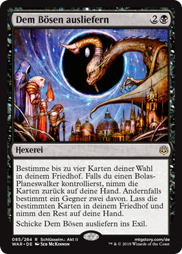 | Rules | Choose up to four target cards in your graveyard. If you control a Bolas planeswalker, return those cards to your hand. Otherwise, an opponent chooses two of them. Leave the chosen cards in your graveyard and put the rest into your hand. Exile Deliver Unto Evil. |