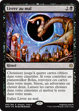 | Rules | Choose up to four target cards in your graveyard. If you control a Bolas planeswalker, return those cards to your hand. Otherwise, an opponent chooses two of them. Leave the chosen cards in your graveyard and put the rest into your hand. Exile Deliver Unto Evil. |