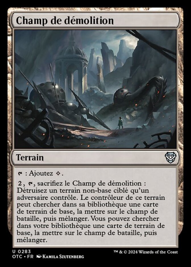 | Rules | : Add . , , Sacrifice Demolition Field: Destroy target nonbasic land an opponent controls. That land's controller may search their library for a basic land card, put it onto the battlefield, then shuffle. You may search your library for a basic land card, put it onto the battlefield, then shuffle. |