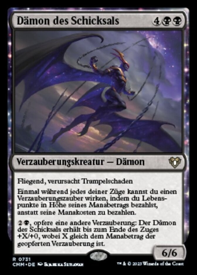 | Rules | Flying, trample Once during each of your turns, you may cast an enchantment spell by paying life equal to its mana value rather than paying its mana cost. , Sacrifice another enchantment: Demon of Fate's Design gets +X/+0 until end of turn, where X is the sacrificed enchantment's mana value. |