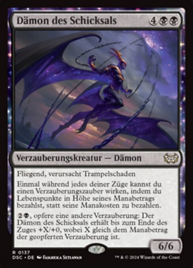 | Rules | Flying, trample Once during each of your turns, you may cast an enchantment spell by paying life equal to its mana value rather than paying its mana cost. , Sacrifice another enchantment: Demon of Fate's Design gets +X/+0 until end of turn, where X is the sacrificed enchantment's mana value. |