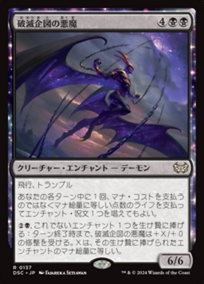 | Rules | Flying, trample Once during each of your turns, you may cast an enchantment spell by paying life equal to its mana value rather than paying its mana cost. , Sacrifice another enchantment: Demon of Fate's Design gets +X/+0 until end of turn, where X is the sacrificed enchantment's mana value. |