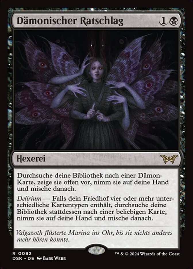 | Rules | Search your library for a Demon card, reveal it, put it into your hand, then shuffle. Delirium — If there are four or more card types among cards in your graveyard, instead search your library for any card, put it into your hand, then shuffle. |