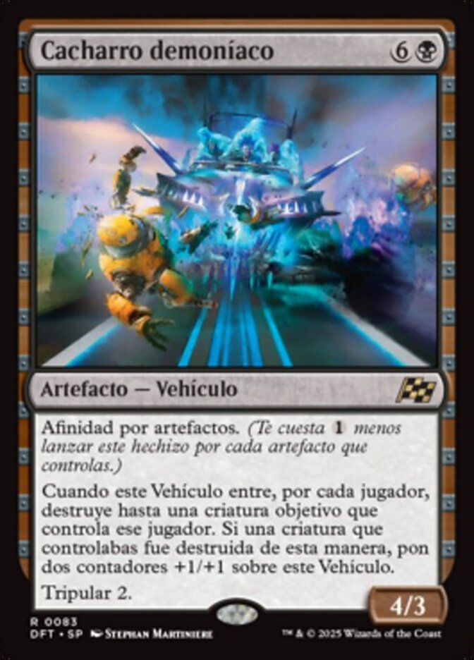 | Rules | Affinity for artifacts (This spell costs less to cast for each artifact you control.) When this Vehicle enters, for each player, destroy up to one target creature that player controls. If a creature you controlled was destroyed this way, put two +1/+1 counters on this Vehicle. Crew 2 |