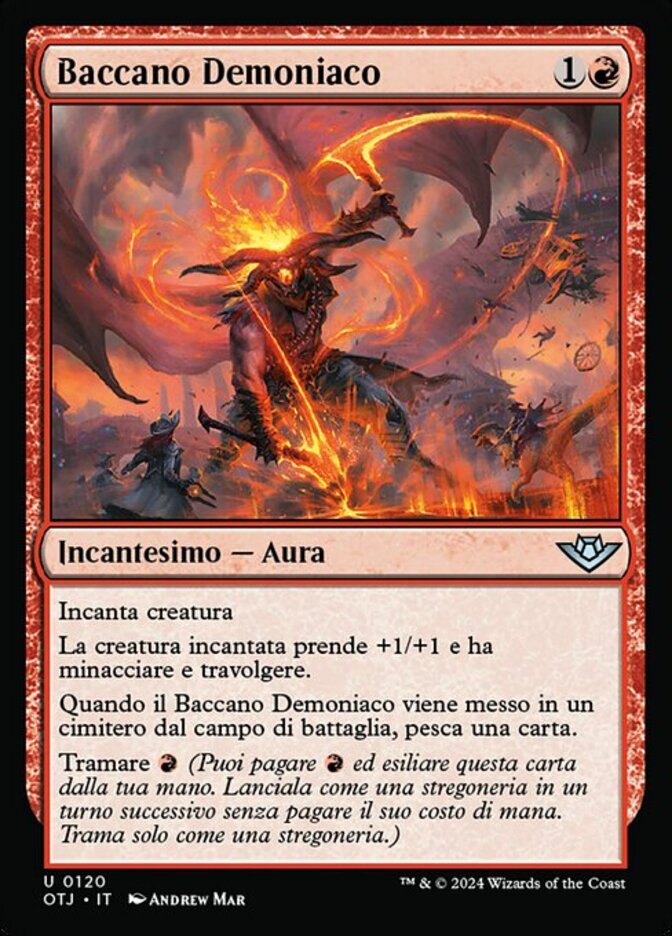 | Rules | Enchant creature Enchanted creature gets +1/+1 and has menace and trample. When Demonic Ruckus is put into a graveyard from the battlefield, draw a card. Plot (You may pay and exile this card from your hand. Cast it as a sorcery on a later turn without paying its mana cost. Plot only as a sorcery.) |