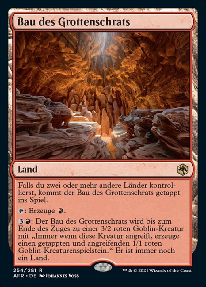 | Rules | If you control two or more other lands, Den of the Bugbear enters the battlefield tapped. : Add . : Until end of turn, Den of the Bugbear becomes a 3/2 red Goblin creature with "Whenever this creature attacks, create a 1/1 red Goblin creature token that's tapped and attacking." It's still a land. |