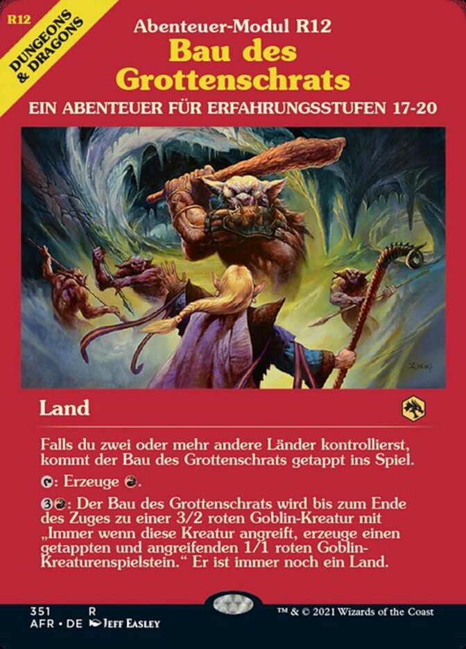 | Rules | If you control two or more other lands, Den of the Bugbear enters the battlefield tapped. : Add . : Until end of turn, Den of the Bugbear becomes a 3/2 red Goblin creature with "Whenever this creature attacks, create a 1/1 red Goblin creature token that's tapped and attacking." It's still a land. |