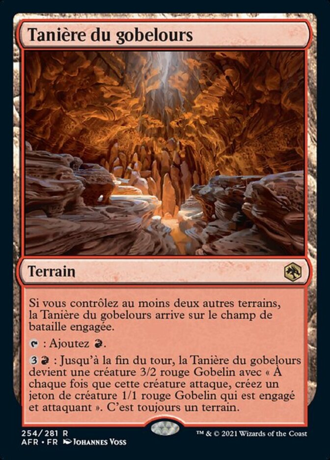 | Rules | If you control two or more other lands, Den of the Bugbear enters the battlefield tapped. : Add . : Until end of turn, Den of the Bugbear becomes a 3/2 red Goblin creature with "Whenever this creature attacks, create a 1/1 red Goblin creature token that's tapped and attacking." It's still a land. |