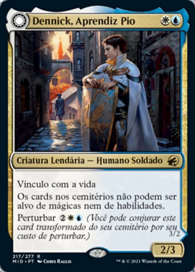 | Rules | Lifelink Cards in graveyards can't be the targets of spells or abilities. Disturb (You may cast this card from your graveyard transformed for its disturb cost.) // Flying Whenever one or more creature cards are put into graveyards from anywhere, investigate. This ability triggers only once each turn. (Create a colorless Clue artifact token with ", Sacrifice this artifact: Draw a card.") If Dennick, Pious Apparition would be put into a graveyard from anywhere, exile it instead. |